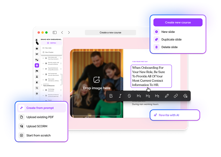 Generate a new course in minutes using AI prompts, PDFs, existing documents, and company policies.